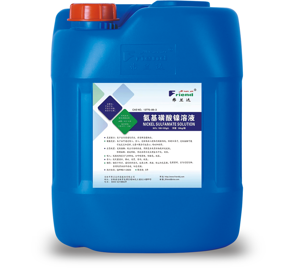 氨基磺酸鎳溶液(Nickel Sulfamate Solution) 分 子式:Ni(NH2SO3)2 分子量:250.87 性  狀:深綠色透明液體。 用 途:主要用于精密電鍍、電鑄、電子工業等。 包 裝:HDPE桶裝,每桶30公斤。 儲 運:運輸時包裝要密封,運輸過程中防止受熱,貯存在陰涼,通風處。
